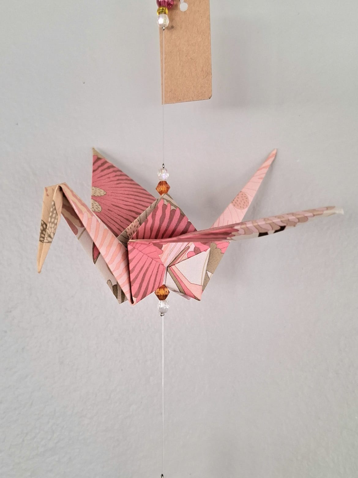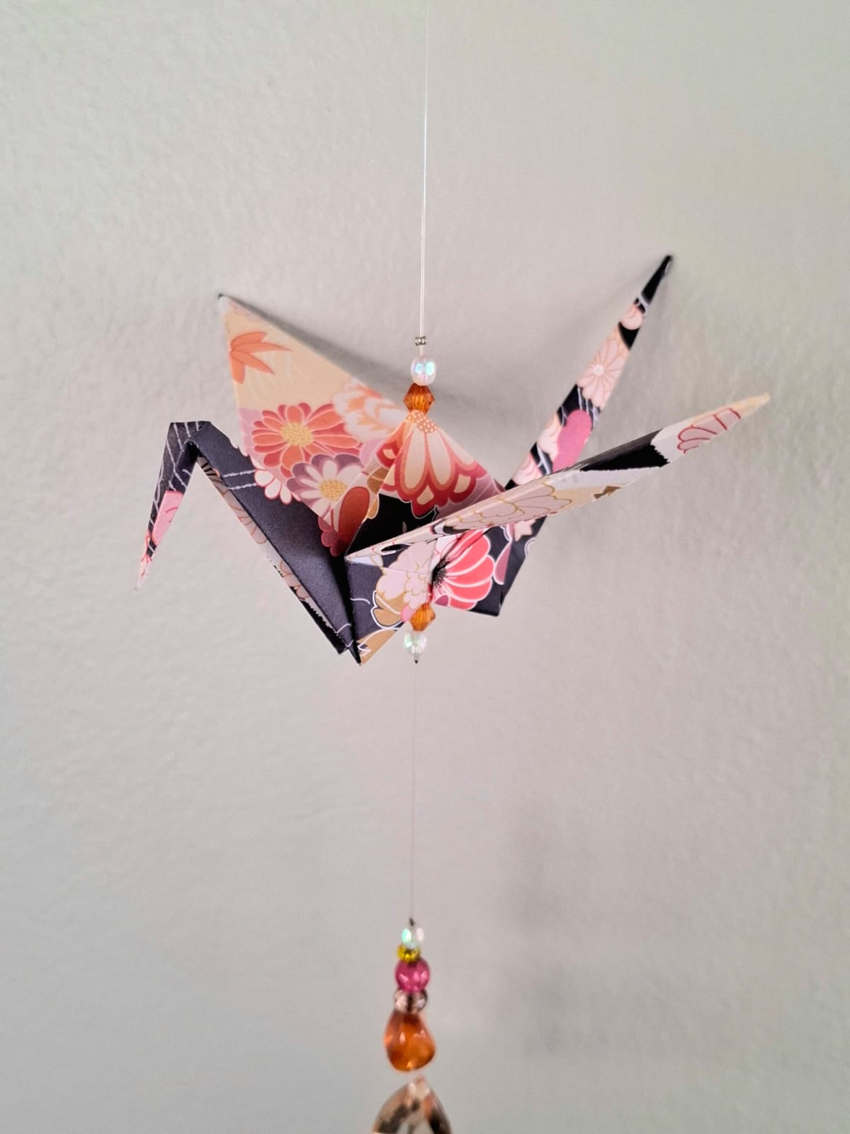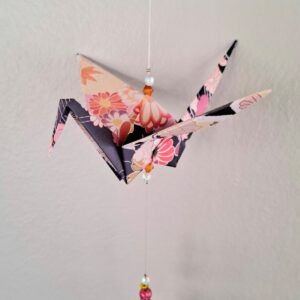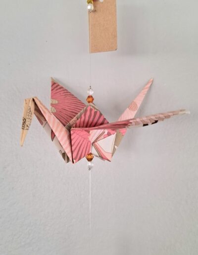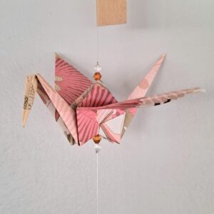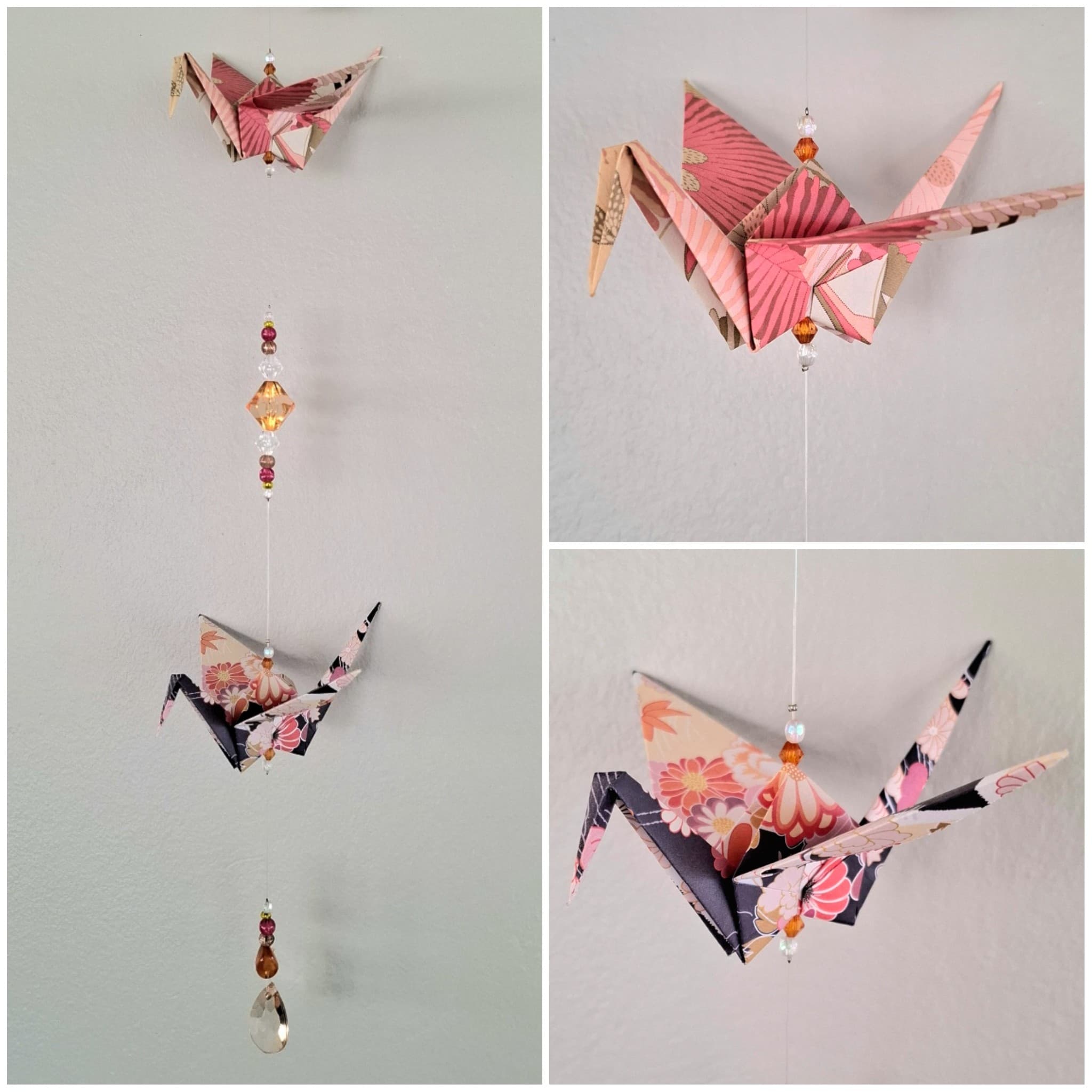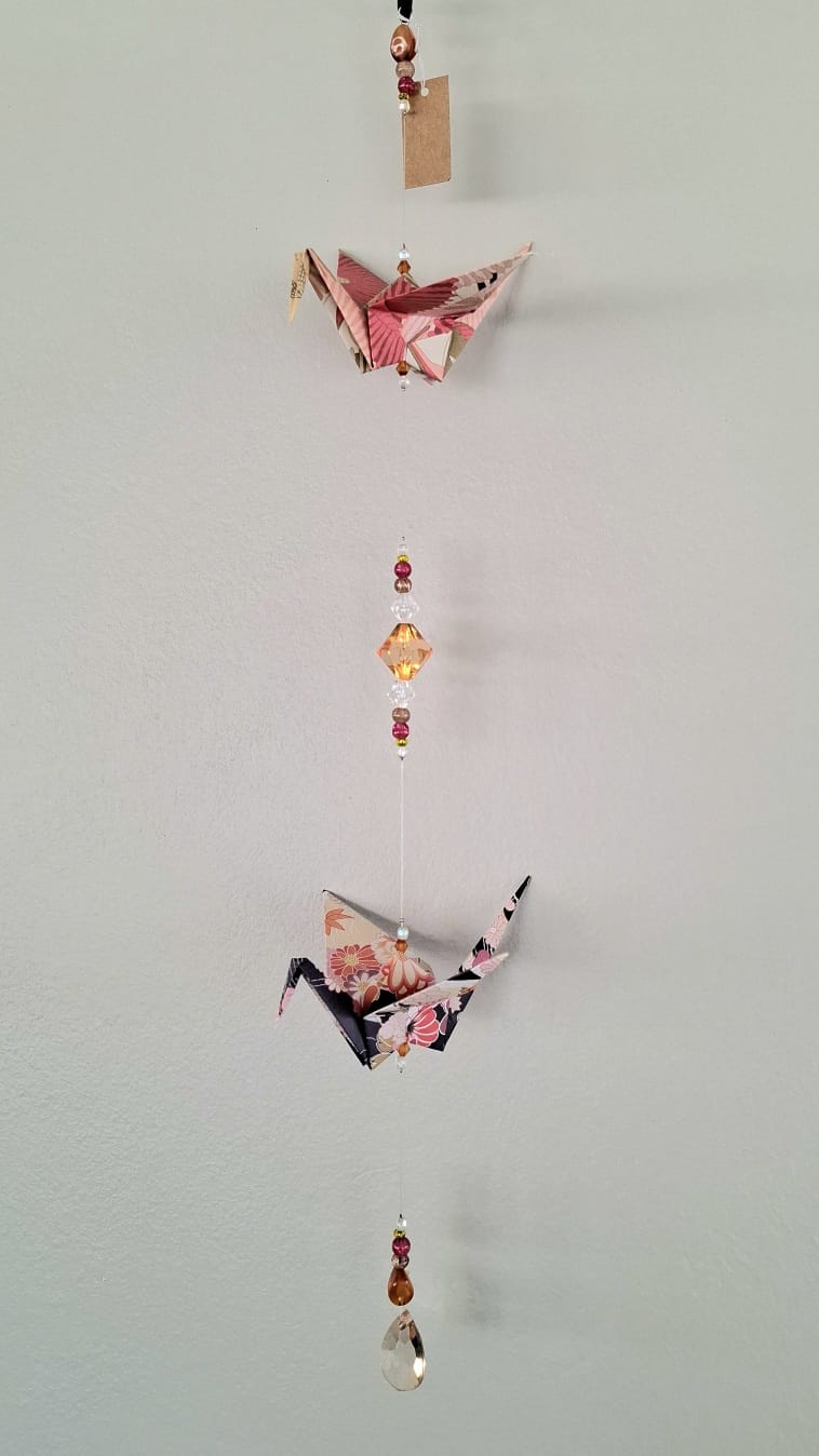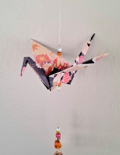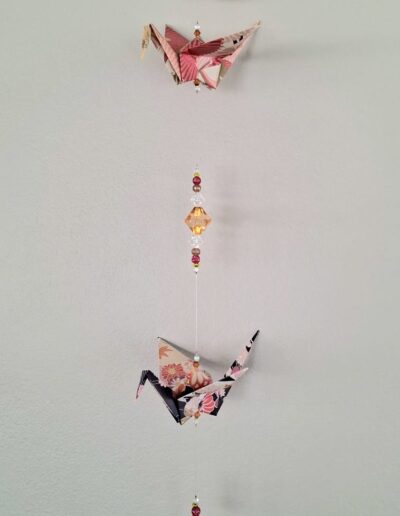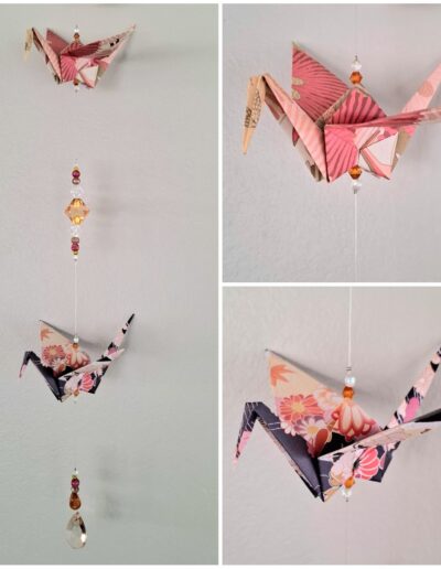 The origami cranes are carefully folded by hand. They are then strung together with both matching and contrasting beads made from a mix of glass, acrylic, wood, and even upcycled chandelier crystal pieces. This allows these mobiles to double as suncatchers as they reflect the light that hits them.