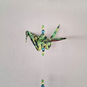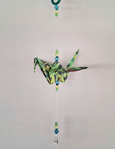The origami cranes are carefully folded by hand. They are then strung together with both matching and contrasting beads made from a mix of glass, acrylic, wood, and even upcycled chandelier crystal pieces. This allows these mobiles to double as suncatchers as they reflect the light that hits them.