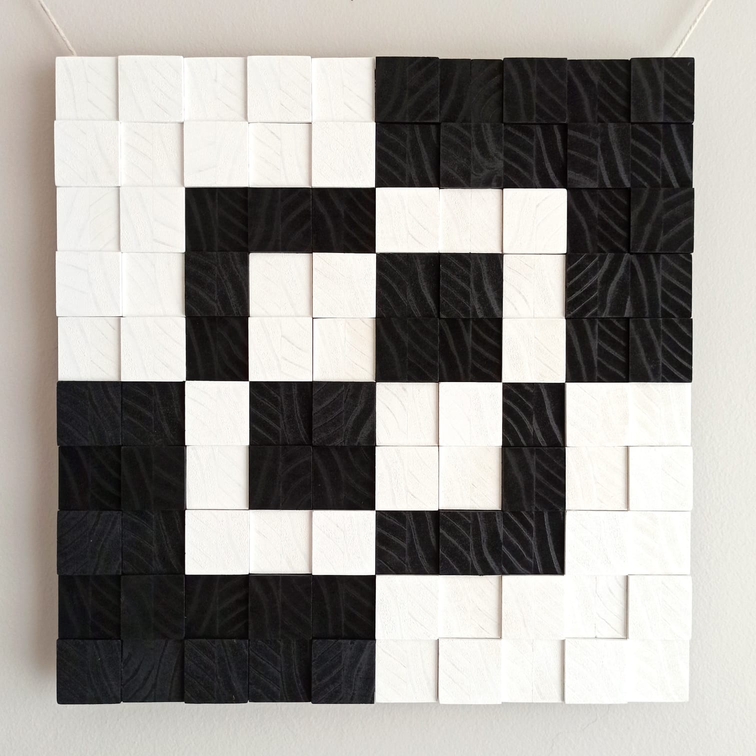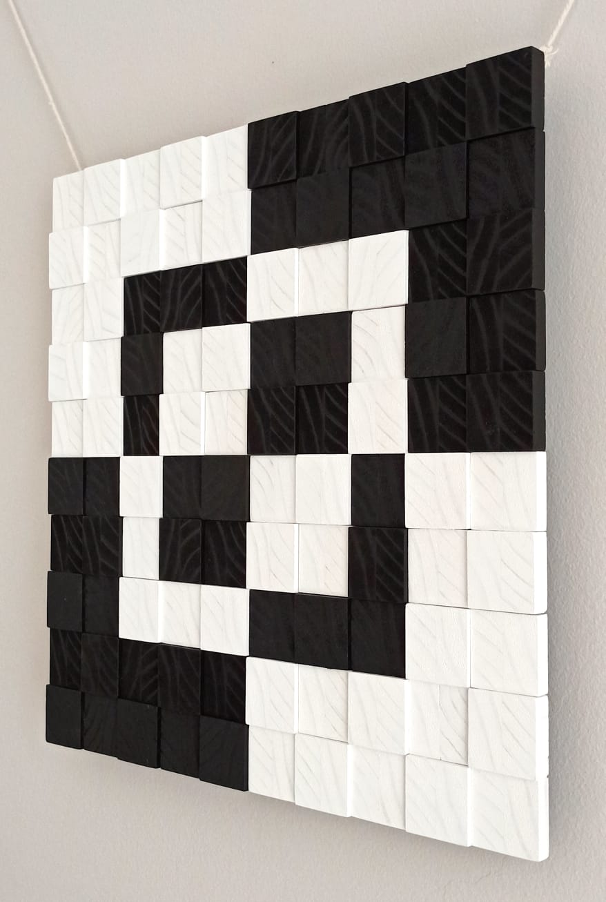 Elevate your space with this perfect blend of modern design and timeless craftsmanship. This stylish piece features a striking geometric pattern of black and white wooden tiles, creating a bold contrast that adds depth and sophistication to any room.